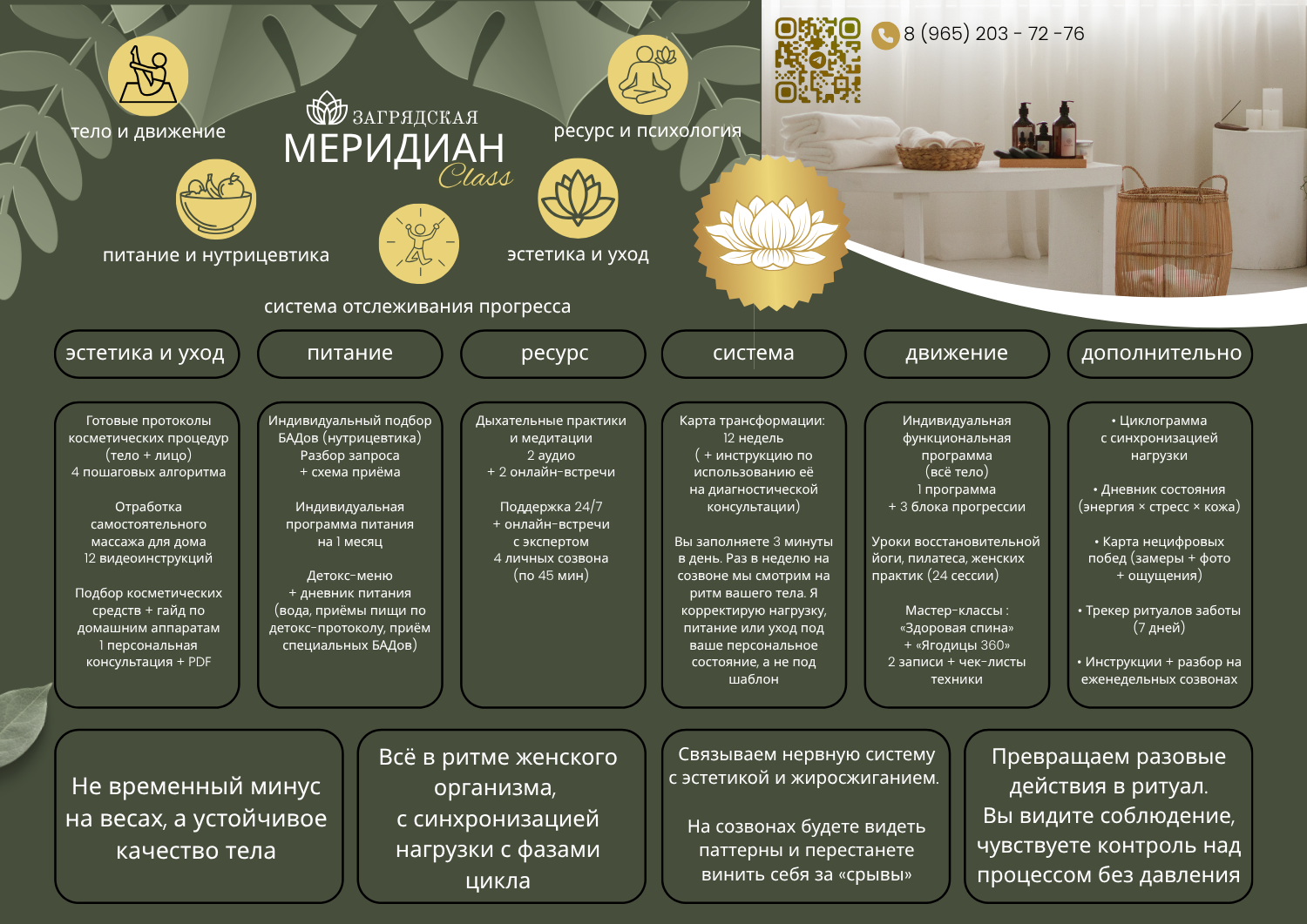 Особое внимание уделено нутрицевтике, меню персональной программы питания и детокс-меню, подобранным индивидуально, а также косметическим протоколам для лица и тела. Программа сопровождается круглосуточной поддержкой куратора и онлайн-встречами, что обеспечивает постоянную мотивацию и контроль. Такой подход помогает не только улучшить физическое здоровье, но и обрести устойчивое эмоциональное равновесие.